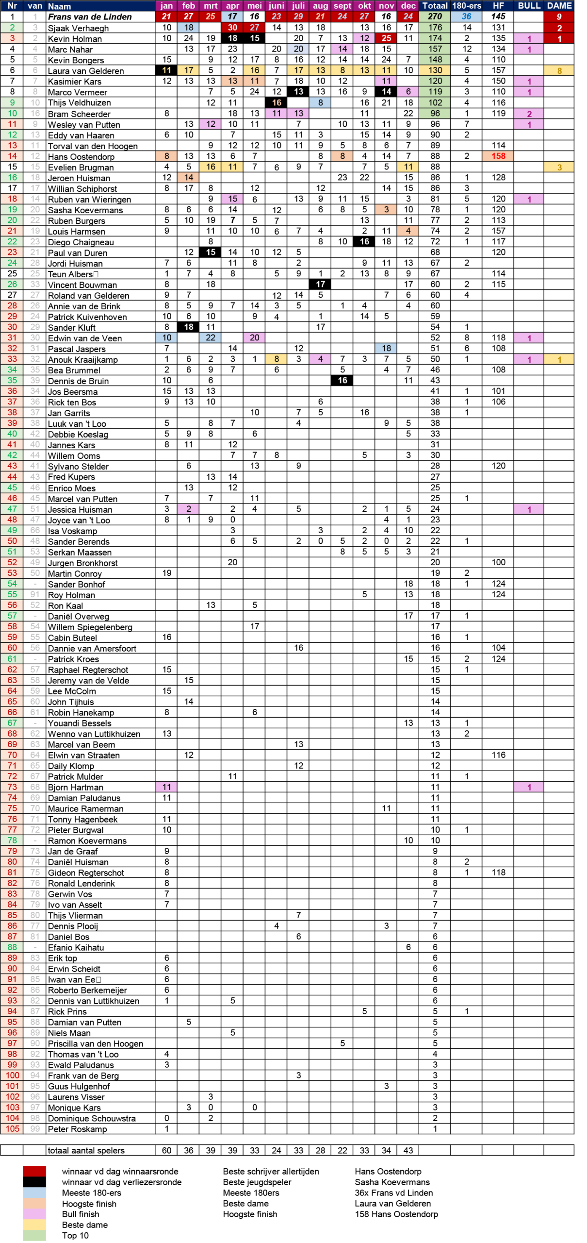 Zoals gezegd zijn de meeste 180-ers ook door Frans van de Linden gegooid: 36! Een record
