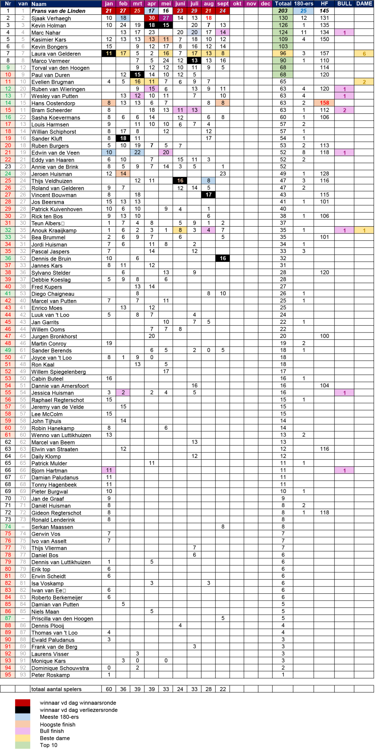De bull 🎯 werd gegooid door Marc Nahar. De meeste 180-ers van de dag (3) werd gegooid door Frans van de Linden. De hoogste finish was voor Hans Oostendorp (120).